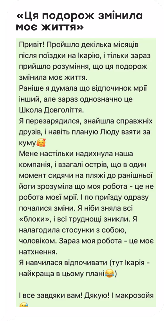 Ми проводили школу довголіття вже 15 разів. Були і в Японії, і в інших країнах, але останнім часом зупинилися на острові Ікарія в Греції.